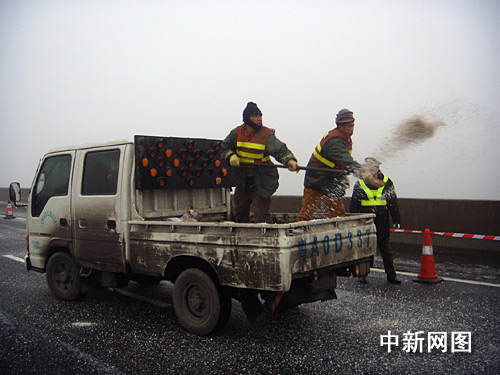 上午8點,冰霜再次在京珠北北行41公里處出現,京珠交警部門隨即將所有北行車輛緊急截停,惡劣天氣緊急處置預案再度啟動。公路維護部門對結冰橋面多次拋灑工業鹽實施溶冰作業,交警和路政部門在結冰路段擺設錐筒,減少車道,控制行車速度,并在云巖坡頂實施間斷放行等交通管制,同時利用警車壓道和短暫分流等方式疏導現場滯留車輛,緩解交通壓力。最終,長達3公里的車龍在警車的帶領下安全的駛離了危險地帶,連續兩天,沒有重特大交通事故和嚴重車輛堵塞出現。