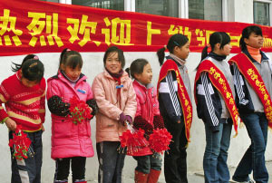 下午2時50分,捐贈單位代表在學生“熱烈歡迎”聲中來到學校。幾位代表發言后,他們逐個班級向學生們贈送書包、詞典、筆記本等文具。其中一名代表告訴記者:“本來說好2點鐘來的,后來開會耽誤了!