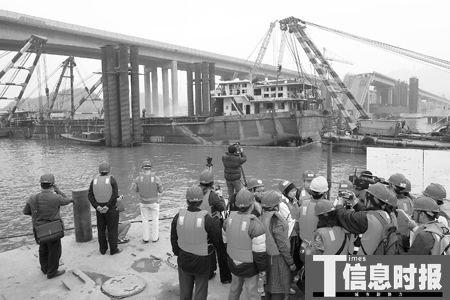據悉,橋體拆除工作的第一階段工作包括穩定墩、支架墩、牽制墩、臨時墩及牽引穩定體系等。記者昨天現場看到,第一階段穩定墩、支架墩的全部施工工作已完成,主牽引墩、1#、2#、3#牽制墩,1#、2#、3#臨時墩的承臺也全部完成,1#、2#、3#臨時墩鋼橫梁也均已至位,即將安裝到位。切割船體移開后,坍塌斜梁將會通過牽引系牽制穩定,分塊切除清理,“除了斜梁段將會被切斷拆除外,緊接斜梁的橋身也要被切除一部分,長度大約為88米,這項工作我們力爭用兩個月時間清理完善。”