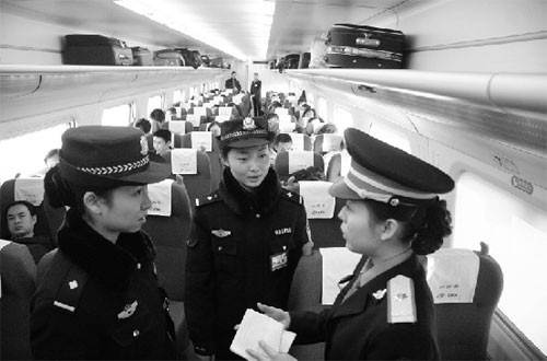 李鶴說,從1月3日起,就有6名女警登上了部分動車組進(jìn)行了實驗,旅客們普遍感覺眼前一亮。當(dāng)好動車組乘警不容易,每周她們都要接受嚴(yán)格的培訓(xùn),包括服務(wù)禮儀、警容風(fēng)紀(jì)、處置突發(fā)事件等,還被派往沈陽桃仙國際機場學(xué)習(xí)空中保衛(wèi)。英語測試、日常對話也必須過關(guān)。