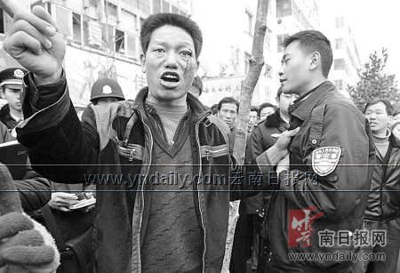 昨天(15日)上午11時40分,現場聚集了不少圍觀市民,數名警察在維持秩序。李賢堂靠著一棵手腕粗的行道樹,緊緊抓住一名臂章有“警察”字樣的執法人員不肯放手。不管警察怎樣勸說,李賢堂就是不讓對方離開。李氏兄弟是重慶市武隆縣人,李賢堂在人民東路附近一小區守大門。李賢堂情緒非常激動:“我二哥不僅被打傷,我也被打傷,現在頭還昏昏沉沉的!”