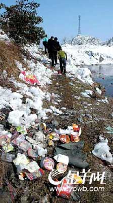 “我們村蓄水池的水來自高速公路旁的“幸福泉”,過去這里的水一直甘甜清爽,春節前,大量的客貨車滯留高速公路上,旅客和司機便在泉水旁就地大小便,亂扔飯盒、方便面,焚燒柴油取暖,高速公路上撒下了大量工業鹽,之后水源就被污染了(見圖)。”當地村干部告訴記者。在他的帶領下,記者來到了幸福泉旁,發黑的水源上漂浮著清晰可見的油漬,泉水旁,吃完的方便面包裝、殘余的餅干盒、旅客們留下的襪子等生活垃圾隨處可見。