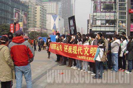 昨日下午,一聲聲“抵制陳冠希,還我現代文明!”的口號從(成都)香檳廣場傳來,吸引了大批市民圍觀。50多個戴著白口罩的年輕人在廣場上整齊地排成幾排,站在第一排的年輕人還拉起一條10多米長的“萬人抵制陳冠希,還我現代文明”紅色橫幅。在喊口號的同時,還不時有人在橫幅簽名。這群年輕人正是“中國反明星成都分會”的會員,正在搞一個“反對明星萬人大簽名”的活動。據了解,這次活動是今年全國“反明星”活動的“開幕戰”,隨后,全國各地都將舉行各種“反明星”活動。他們稱,一旦有“明星大事”發生,他們就將隨時“公開抗擊”。