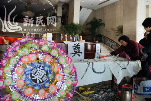 3月11日上午9點30分左右,新民網(wǎng)記者在中亞飯店看到,跳樓男子的家人仍聚集在中亞飯店的大堂內(nèi),中亞飯店大堂內(nèi)的顯著位置已經(jīng)設有靈堂,大堂內(nèi)擺放著祭奠用的臺子,祭臺旁邊擺放著2個花圈,死者的親人在祭臺前焚燒紙祭奠死者。