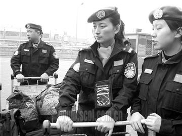 昨日上午10時20分,早餐午餐合并,隊員們匆匆吃了兩口飯后整隊出發,乘車前往首都機場。汽車上,很安靜,陳春暉一直在發短信,待機屏幕上五個月大兒子的照片一直在眼前。12時10分,警隊到達機場,隊員們下車等候登機。此時,不少隊員在打接電話;新聞媒體也插空采訪隊員。陳春暉一直很平靜,沒有電話也沒有發短信,她幫忙檢查了劉莉的行李箱,又給張君整理了一下圍巾。安檢前,18名隊員在候機樓前留下了出國前的最后一張合影。(王柳 李健 記者 楊元祿 攝影)