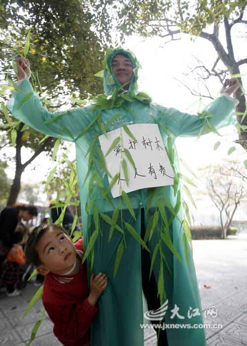 據(jù)了解,這群青年志愿者希望通過行為藝術(shù),呼吁人們保護植物,愛護環(huán)境。他們從頭到腳用綠色塑料雨衣和塑料花、塑料枝葉裝扮成大樹和花朵。組織者告訴記者,全球環(huán)境變得越來越惡劣,如果大家不愛護樹木,將來人類只能用塑料花、塑料樹來替代。(李偉 梁冰 李慧)
