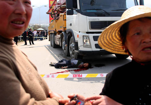 上午12時30分許,記者趕到現(xiàn)場,看到一輛黃色的混凝土輸送泵車被人群包圍著,一位身穿黃色制服的交通征稽執(zhí)法人員,坐在駕駛室里趴在方向盤上一動不動。記者擠進人群看到,一位中年民工躺在車的右前輪子前面的血泊中,人已經(jīng)死亡。周圍的群眾、游客情緒激動,指著車上的執(zhí)法人員罵聲一片。