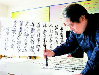 昨天,記者在延慶縣延慶鎮(zhèn)米家堡村見(jiàn)到了49歲的張海河。操著濃重延慶口音的他告訴記者:“我只有初中文化,識(shí)字不多,先是種地,后又做建筑安裝,沒(méi)想到老了老了,還能練書法,讓鄉(xiāng)親們覺(jué)得我是個(gè)文化人!”