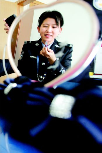 “警花”們上崗前都要統(tǒng)一化淡妝,頭花是經(jīng)過認(rèn)可的統(tǒng)一佩戴。