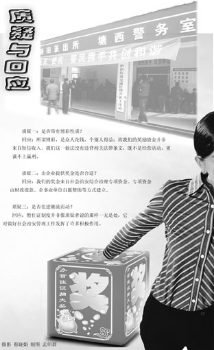 此舉引發了輿論的種種質疑:有人說,它帶有博彩嫌疑;有人說,假如獎金由企業贊助,將為執法不公打下伏筆;有人說,有獎辦證在一定程度上強化了暫住證管理制度的作用,實際上是一種“逆潮流而動”之舉。