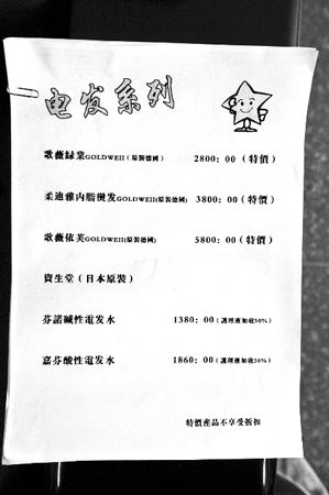 在該店提供給工商部門的材料中,兩名女學生的消費清單上寫有“水洗剪吹38元,資生堂特護1800元,資生堂酸性1860元,蠢絲蛋白680元,歌薇果酸洗60元,歌薇果酸護60元”等字樣。