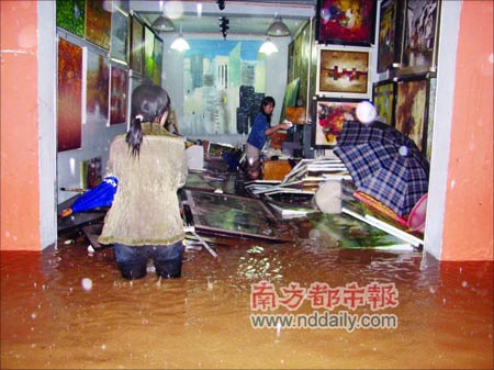 “水深的時候,洪水已經淹到我胸口了。”大芬油畫村一身高近1米8左右的畫匠宿先生紅著雙眼告訴記者,19日晚8時左右他接到了油畫村相關管理部門的電話,可因為狂風暴雨,路面大塞車,車開到布吉鎮政府時,他舍車小跑到畫廊,趟著齊胸高的洪水趕到了畫廊!八尴壬f,他看到所有的水彩畫都泡在水里。