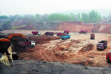 4月18日,記者來到現場,在西施煤業公司東南角約100米處,記者看到,一個長寬上百米,深20米的巨大露天采坑內,數臺大型挖掘機和十幾輛大卡車正在緊張忙碌地作業(如圖)。采坑東部的挖掘機揮舞手臂,將從坑壁挖下來的土裝進卡車,隨即這些土便被運往采坑西側進行填埋。在采坑的東南角及西側邊緣,麥苗裸露在新鮮的泥土外,尚未被挖掘的地表已經出現裂紋,綠油油的麥苗生長在夾縫中,岌岌可危。而西南側的深坑中,黑糊糊的煤層清晰可見。據當地一名知情群眾講,這個露天煤礦已經開采了有兩年時間,把麥田和樹木都毀了,群眾有意見,煤礦就賠點錢。雖然是有群眾向登封市國土資源部門投訴,但一直沒有被查處。“最近聽說國土資源局來查了,才停止了露天挖煤。”