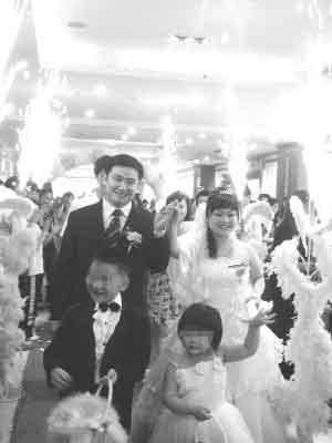 中午12時30分,婚禮正式開始。叮叮和小伙伴一人手提一個裝滿花瓣的小花籃,在玫瑰花亭下站好。當主持人宣布新人入場時,兩人相對而立,隨后帶領新郎新娘緩緩踏上紅地毯。叮叮右手提著花籃,左手抓起一把玫瑰花瓣,用力向空中撒去,始終笑呵呵的,直到把新人帶到婚禮主舞臺。這時,伴娘送上一個“仙女棒”,“我是愛神派來的小天使,我來喚醒你們的愛情……”叮叮拿起“仙女棒”,踮起腳尖走到新郎新娘面前,朝新人手中的水晶球輕輕一點,只見水晶球里藍光四射,現場掌聲一片。