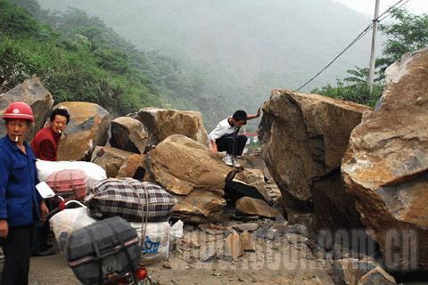 5月12日17點14分,都江堰往汶川方向道路被山頂滾落的巨石阻斷,車輛無法通過,路人試圖翻越巨石堆