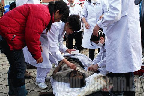 東汽體育館旁邊有一個小學和一個高中,數百名學生遇難。直到下午5點多,體育館前的空地上仍有二十來具尸體被等待運走。