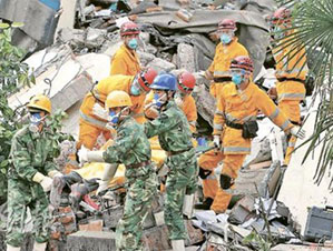 首批到達(dá)四川的20名香港消防員,15日被派到綿竹漢旺鎮(zhèn)協(xié)助救援,他們首個任務(wù)就是在埋有10余人的葉片廠辦公樓廢墟搜救。(圖片來源:明報)