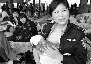 14日,蔣小娟來(lái)到災(zāi)民帳篷區(qū),看到四名嬰兒只能吃一些水和稀飯,一名嬰兒的母親還在醫(yī)院搶救!八麄?nèi)鞗](méi)有吃奶了!笔Y小娟撩起衣衫露出乳房,輕輕地將乳頭塞進(jìn)嬰兒的嘴里。