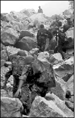 在小分隊爬行上方20米處,鋼盔大的石頭沖著小分隊隊員砸下來。