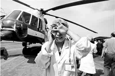 昨天下午4點05分,東方通用航空公司的一架米1-71直升機緩緩降落在廣漢機場停機坪上。艙門打開,40歲的女護士杜娟下了飛機,招呼著成都120急救中心的醫護人員將傷員抬到急救車上。杜娟是北川縣禹里羌族鄉衛生院的護士。5·12地震后,禹里與世隔絕,直到昨天才等到直升機將重傷者送出。杜娟隨機照顧患者。傷員都下了飛機后,杜娟向于波借手機,電話打通時,她手開始顫抖,撕心裂肺的哭聲終于無法忍住。那是她六天后,第一次給外面的親人打電話。巨大的螺旋槳轉動聲中,人們只能依稀聽到她的哭訴:“我要去找他,不能連個尸體都沒有。”于波默默地看著她,不到一個小時前,他還覺得這個女護士嚴厲得有點過分。