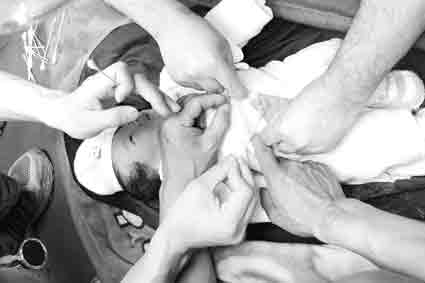 9點(diǎn)35分,記者再次回到岷江大壩旁的主干道。從映秀方向出來的老鄉(xiāng)逐漸增多。在一座橋旁,從湖北宜興遠(yuǎn)道而來的李先生靠著祖?zhèn)鞯乃幏胶褪炙嚕瑸槭軅娜诉M(jìn)行及時(shí)治療。