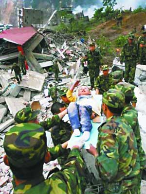 5月13日,武警戰士們從廢墟中營救出了3歲的郎錚,他吃力地舉起傷痕累累的右手,向軍人叔叔們敬了少先隊禮。郎錚的舉動被很多人評價為“地震中最溫情的畫面之一”。