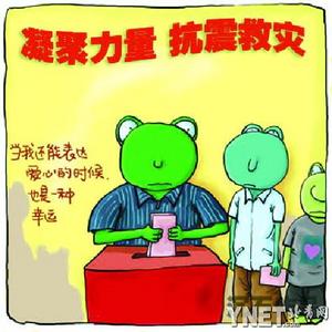 在天涯社區(qū)張貼的漫畫里,小鴨子表情嚴(yán)肅地對(duì)小雞說:“賑災(zāi)重建,長(zhǎng)期任務(wù)”;三只小老鼠不停用鐵鍬挖坑蓋房,還拿著大喇叭高喊:“眾志成城,共抗震災(zāi)”;“蘑菇家族”的醫(yī)生則身背降落傘空降災(zāi)區(qū)……