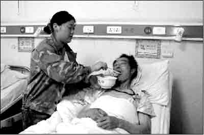 昨天是陳仁平在綿陽(yáng)第三醫(yī)院的最后一晚,胃口極好的他晚餐吃了3個(gè)餃子。在北川陳家壩的山中被埋后,56歲的陳仁平靠著兩個(gè)雞蛋硬撐了169個(gè)小時(shí),經(jīng)過(guò)診斷,他的盆骨骨折。