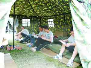 四川省北川中學(xué),這塊明顯有些泛舊的校牌,此時端正地懸掛在位于綿陽市長虹培訓(xùn)中心一座二層小樓的外墻上。培訓(xùn)中心的大門被拳頭粗的鐵鎖牢牢關(guān)緊,只有當(dāng)教職員工或記者進(jìn)出時,才會擠出一條狹窄的縫隙。走進(jìn)其中,人們可以看到一座座整齊排列的綠色迷彩帳篷,不時會有孩子們擦身而過。他們的臉上沒有憂傷,盡管他們才剛從夢魘中驚醒。