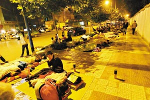 “這幾天還少了些,最恐怖的時(shí)候,市區(qū)二環(huán)周圍全部睡滿了人!蔽靼补こ檀髮W(xué)的一學(xué)生告訴記者,“那段時(shí)間,同學(xué)們都把床單鋪到學(xué)校操場(chǎng)上,一個(gè)大操場(chǎng)一下就睡滿了。我還有個(gè)同學(xué)為了躲避地震,沒拿到畢業(yè)證就‘逃’到北京避災(zāi)去了!