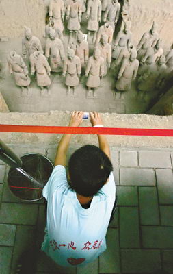 所以被嘆為“同埃及金字塔媲美的世界人類文化寶貴財(cái)富”的兵馬俑,一直受國(guó)外游客格外青睞。但在今天的游客里,偶爾才發(fā)現(xiàn)幾個(gè)金發(fā)游客。直到中午12時(shí),才見(jiàn)到一個(gè)中東國(guó)家的旅游團(tuán)。