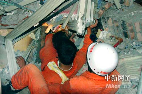 這里還有生命存在!濰坊市公安消防支隊參加救援的官兵迅速聚集在這片廢墟周圍,小心翼翼的搜尋生命奇跡的存在地。這是映秀灣發(fā)電廠的賓館,6層樓建筑已經(jīng)全部垮塌,電廠賓館廢墟堆高約4米,樓板磚墻層層疊壓,上部樓板隨時都有再次坍塌的可能。距現(xiàn)場2米的右側,是一座6層高且遙遙欲墜的未倒塌建筑,余震之中樓體搖搖晃晃,不斷有磚石碎塊掉落,整幢建筑岌岌可危。