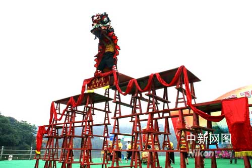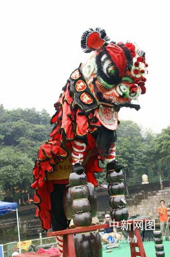 廣東南海西樵山上的天湖公園,一支來自廣東臺(tái)山的傳統(tǒng)南獅正在進(jìn)行絕技表演, “獅子踩沙煲”、“南獅勇闖鐵板橋”接連上演。