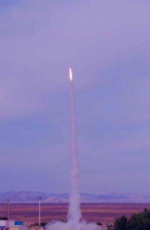 “3,2,1,點火!”昨天上午8時,酒泉衛星發射中心。一聲令下,北京航空航天大學宇航學院學生王虹玥沉著地按下了電子點火按鈕!班亍钡囊宦,“北航一號B”火箭尾部瞬時噴出一股耀眼的火焰,箭體呼嘯而出,留下一道白煙直刺入萬米高空,在廣袤的西部沙漠中,伴隨著一輪噴薄而出的紅日,鐫刻成一幅完美的畫面。