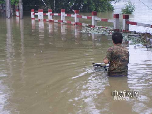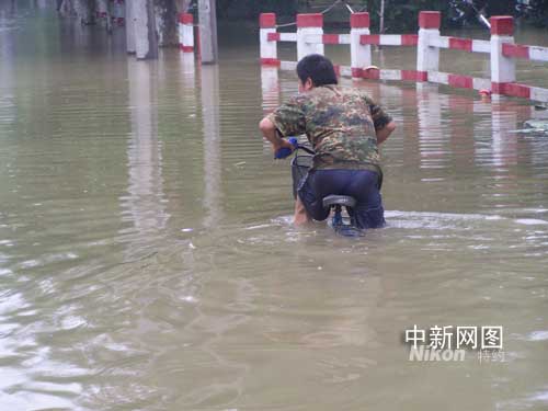 記者跟隨當地政府工作人員乘坐沖鋒舟慰問救助留守居民途中,在當地已部分被淹沒得西溪街,一身穿迷彩服、短褲的中年男子騎著自行車順著街道水面駛來。讓人驚嘆的是,自行車車身完全淹沒在水中,人們從上面只能看到水中的車把手。該男子笑著對工作人員打了招呼,擦船而過,駛過一段路之后,自行車車身才逐漸露出水面。