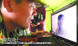 “看見啦!hello,媳婦兒!”昨日16:18,都江堰學府路一處板房搭建地的綠色帳篷內,27歲的新郎倌終于看見了電腦屏幕上穿著潔白婚紗的新娘。整個婚禮僅僅持續了9分鐘,這是一場簡單得不能再簡單的婚禮,卻跨越了千里!新郎倌因為隨部隊入川參加抗震救災,無法如期趕回安徽家中與新娘舉行婚禮,便通過這種方式,完成了對新娘的承諾。