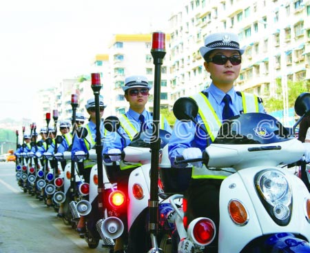 通過嚴格的文化、體能、技能考試和政審后,(貴州)畢節(jié)市交警大隊從畢節(jié)地區(qū)8個縣(市)公安系統(tǒng)考調10名“警花”組建了首支女子交警隊。經(jīng)過三個多月的封閉訓練,近日,10名美麗漂亮的“警花”正式亮相畢節(jié)街頭,開始在畢節(jié)城區(qū)進行交通巡邏、維護交通秩序等交通執(zhí)法活動。