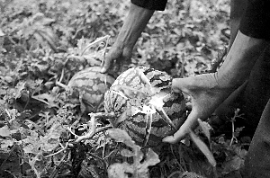 昨日下午6時許,露天瓜地中隨處可見被砸裂的西瓜,有的“傷口”就像子彈打進去一般。“幸免的很少。”瓜農張平翻看瓜秧,藏在下面的西瓜也裂了口。