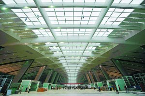 今天早晨記者探訪新北京南站,發(fā)現(xiàn)新建筑大氣、壯觀的現(xiàn)代化風(fēng)格已經(jīng)整體顯現(xiàn)。與傳統(tǒng)火車站方方正正、候車空間封閉的形象迥然不同,相比之下,新南站建筑更像機場航站樓;視野通透、裝飾風(fēng)格簡潔明快。9米高的高架候車大廳白天不需要燈光照明,陽光透過屋頂采光帶傾瀉下來。