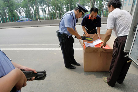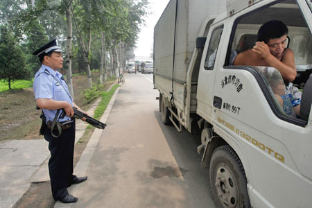 7月10日,北京警方荷槍實彈把守主要進京通道。 人民網