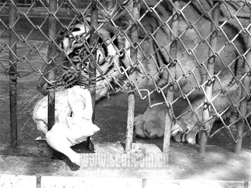 十指連心,動物也不例外。虎掌鋸爪,猶如虎口撥牙。要想成功為“園園”實施剪指甲手術,必須實施麻醉。前日上午10時,技術人員趁“園園”不備,用長竹竿綁上一顆大針頭,將4只陸眠靈麻藥快速推進虎體。15分鐘后,“園園”雙眼時閉時睜伏在地上。不料,30分鐘后,“園園”突然起身,東倒西歪地走了起來。“看來藥量太輕,未能完全將它麻醉。”10時38分,技術人員為“園園”補了一支麻藥,體重約150公斤的東北虎,兩腿一軟倒在地上再也爬不起來了。2名工作人員抓住時機,快速將“園園”的右腿拖出鐵欄外,并用繩索牢牢捆綁住虎掌,用鋼絲鉗將虎爪因定。只聽一陣“嘩!嘩!嘩”的拉鋸聲,一名工作人員就像鋸鋼管一樣,奮力朝著虎爪的第二只指甲猛鋸。“嗡!嗡!”就在工作人員即將鋸掉首枚虎爪時,劇烈的疼痛感將休眠中的“園園”痛醒,連續發出兩聲怒吼的同時,全身一陣猛抖,欲掙脫束縛拖回被綁的右掌。然而,5支麻藥的藥效已使此時的東北虎有心無力,徒勞一陣后進入夢鄉。