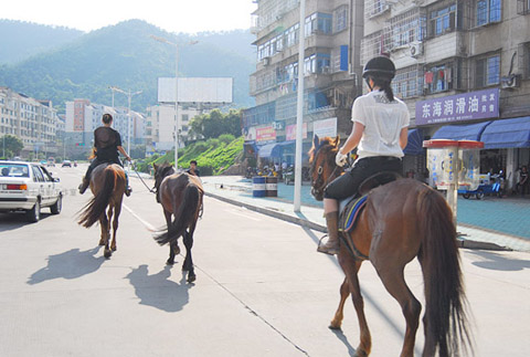 連日來的傍晚時分,只要天氣晴好,(浙江)諸暨最繁華的街區就會出現這樣一副場景:兩三名時尚男女,身穿騎師服裝,騎著高頭大馬,旁若無人地在車流中穿行。途經之處,總引得好奇市民拿起手機、相機一通抓拍。