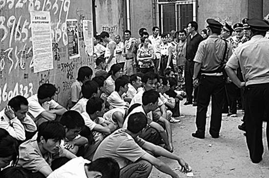 記者隨同民警清查時(shí)發(fā)現(xiàn),樓房?jī)?nèi)幾乎每個(gè)房間都是房門(mén)緊鎖,任由外面的民警怎么敲門(mén),里面的人就是不開(kāi)門(mén)。在二樓的一個(gè)房間外,民警敲門(mén)足足幾分鐘始終無(wú)人開(kāi)門(mén),于是將門(mén)鎖撬開(kāi)進(jìn)入,發(fā)現(xiàn)簡(jiǎn)陋的客廳里,靠四周墻壁坐著20多個(gè)年輕人,男的占大多數(shù)。