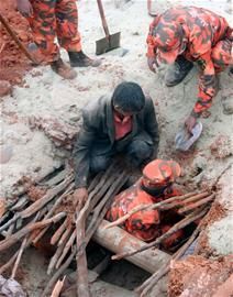 由于該男子一家居住的是土坯房,垮塌后已變成一堆紅土,根本分不出原有結(jié)構(gòu),因此廚房、堂屋的準確位置無法正確辨認,一連五六個小時的搜救沒有任何進展。不得已,大家只得從廢墟邊上開始,展開地毯式搜索,一點一點地掘進。不久,救援人員在堂屋找到了被埋的15歲少年。他是中年男子的兒子,已經(jīng)死亡。