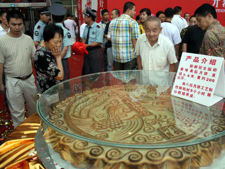 “我們這個(gè)鮮花月餅王直徑1.6米,重1600斤,展示完后將免費(fèi)分給參加月餅節(jié)的市民品嘗。”1600斤重的鮮花月餅制作企業(yè)麥的多總經(jīng)理呂元平告訴記者,月餅面上有八個(gè)嫦娥奔月的小圓月餅象征2008年,月餅中間是龍鳳呈翔圖案,四周則有祥云圍繞。“這個(gè)可供萬(wàn)人分食的月餅寓意四川人民地震后萬(wàn)眾一心,希望恢復(fù)祥和美好新生活的祝愿。”呂元平透露說(shuō),大月餅由二十多個(gè)高級(jí)烘焙技師花了五天時(shí)間才制作完成。