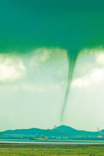 龍卷風是一種伴隨著高速旋轉的漏斗狀云柱的強風渦旋,中心風速可達100米/秒-200米/秒,最大300米/秒。龍卷風具有很大的吸吮作用,可把海(湖)水吸離海(湖)面,形成水柱,然后同云相接,俗稱“龍取水”。由于龍卷風內部空氣極為稀薄,導致溫度急劇降低,促使水汽迅速凝結,這是形成漏斗云柱的重要原因。漏斗云柱的直徑,平均只有250米左右。龍卷風產生于強烈不穩定的積雨云中。它的形成與暖濕空氣強烈上升、冷空氣南下、地形作用等有關。它的生命史短暫,一般維持十幾分鐘到一兩小時,但其破壞力驚人,能把大樹連根拔起,建筑物吹倒,或把部分地面物卷至空中。 (來源:今日早報 作者:倪立剛 老黑)