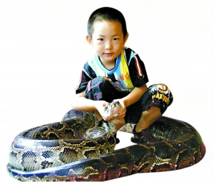 大多數小朋友看到冷冰冰、滑溜溜的蛇都會嚇得趕緊躲開,可8歲的秉哲卻與一條重69公斤的巨蟒成了莫逆之交。秉哲與父親帶著蟒蛇來到了東莞常平隱賢山莊,要在國慶期間表演“人蛇情深”。秉哲的父親告訴記者,秉哲9個月大時,就跟蟒蛇在一起玩。他夏天貪戀蟒蛇冷冷的體溫,把蟒蛇當枕頭睡覺,冬天擔心蟒蛇受凍,則為“好朋友”鋪毛毯。
