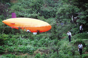 25日下午3點,岷山昆明制藥廠內,一“不明飛行物”突然闖入,降落在半山腰上,周圍近百住戶上山圍觀,一些人以為是UFO,數輛警車載著近30名警察趕到現場。其實,“不明飛行物”只是一艘普通的飛艇,是某航模公司與某火電廠架設高空電線用的,因為下雨,遙控器失靈,發動機停止工作,最后落了下來。(據都市時報)