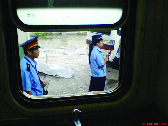 圖:黃先生在車廂里用手機拍下尸體被卸在車站上。