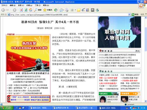 同時(shí),在國(guó)內(nèi)多家網(wǎng)站社區(qū)和論壇內(nèi)也出現(xiàn)一則標(biāo)題為《桂林全州10天驚現(xiàn)五具少女裸尸》的網(wǎng)絡(luò)貼子。一時(shí)間,這條消息在網(wǎng)絡(luò)瘋傳開來(lái)!